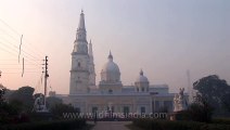 Begum Sumru's Basilica of Our Lady Of Graces, in Sardhana, near Meerut, Uttar Pradesh, India.<br /><br />As you are about to leave Meerut along the road to Muzaffarnagar, Roorkee and Dehra Dun, you see a sign board on your left with Sardhana written on it in bold type. It stands there to indicate the road that turns off to a town 22 kms away. The road to Sardhana is tarred and for the most part shaded by trees on either side. After 16 kms you cross the broad Ganges canal built in 1848. Then the road turns right, and as it does, you see the church of Sardhana in the distance. On the side of the road, to the right of you, you see a small canal that was dug many years ago by the Begum of Sardhana, as an outlet for the water that used to flood the lower part of Sardhana during the monsoon.<br /><br />As you are about to enter Sardhana, with the church dwarfing all the buildings around it, if you look to your left, you will notice large monuments in Muslim art, about two hundred yards away. This is the catholic graveyard, now under the care of the Archaeological Department, and within whose sacred ground, the remains of many, connected with the Begum, lie buried under large monuments erected to their memory.<br /><br />To your right, as you enter Sardhana, is a tarred road that comes from Daurala, a town famous for its sweets. Barely 15 kms away, this is the closest railway station. Many find it more convenient to come to Daurala by train and from there catch a bus for Sardhana. Buses run every hour. But on the other hand the Meerut-Sardhana route, though 22 kms has a bus service every half hour.<br /><br />On entering Sardhana the road runs to the right of a big artificial lake. This lake and another further in, are the result of removing earth to raise the level of the church and form building material for it. The road goes along a wall that encloses a huge compound. Above the tops of the many mango trees that this wall encloses, you see the steeples of the church stretch into the heavens. Eventually you come to a massive gateway on your left, with huge iron gates locked just enough to prevent heavy vehicles from entering. The reason the gates are closed to heavy traffic, is that the road from the gate to the church would easily be spoilt if constantly used by buses and cars.<br /><br />As you look through the gateway, you see the church at the end of a long shady avenue.<br /><br />Source - http://sardhanachurch.org/TowardsSaradhana.aspx<br /><br />The architect of the Church was Antonio Reghellini, an Italian from the city of Vicenza. The Church is based upon St. Peter's Basilica in Rome with touch of Palladio and some Indian architectural influence. The altar and its surrounds are of marble set with coloured stones. Much of the rest of the interior is also in marble, and everything is of the very highest craftsmanship. It is illuminated from an octagon set in the dome, from which the sun streams in. Reghellini completed the church in 11 years. The church is noted for the use of semi precious stone work, a Greek colonnaded veranda,an elevated altar with a stained glass dome and there are two spires and three Roman domes that add to the building's grandeur. Near the sanctuary is a majestic 18 feet high edifice over the Begum's tomb. Carved by the Italian sculptor Adamo Tadolini and transported to Sardhana from Italy to Kolkata by ship and by boats and bullock carts from there, it depicts Begum Sumru on the throne, smoking a hookah with Europeans and Indians in audience. It depicts her with a scroll from Emperor Shah Alam II bestowing upon her the fiefdom of Sardhana after her husband's death. Also depicted are her adopted son David Dyce Sombre and her diwan, Rae Singh who was the great-grandfather of Motilal Nehru.<br /><br />Source - Wikipedia<br /><br />This footage is part of the professionally-shot broadcast stock footage archive of Wilderness Films India Ltd., the largest collection of imagery from South Asia. The Wilderness Films India collection comprises of thousands of hours of high quality broadcast imagery, mostly shot on HDCAM 1080i High Definition, HDV and XDCAM. Write to us for licensing this footage on a broadcast format, for use in your production! We are happy to be commissioned to film for you or else provide you with broadcast crewing and production solutions across South Asia. We pride ourselves in bringing the best of India and South Asia to the world... Reach us at wfi @ vsnl.com and admin@wildfilmsindia.com.