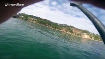 A paddle boarder had an incredible encounter recently with a blue whale off the coast of California.<br /><br />Stunning drone footage, which was filmed on April 25 off Newport Beach, shows the whale surface right beside the boarder who is able to paddle with the marine giant for about 30 seconds.<br /><br />Mark, who caught this on his drone, told Newsflare: "Blue whales are classified as an endangered species, like most whales they were hunted almost to extinction around the world but are slowly increasing in numbers but only have one calf at a time every few years.<br /><br />"If they [whales] felt threatened by a human, it would likely flee the area. This blue whale had been seen feeding in the same area for about three weeks and on this encounter, the whale surfaced very close to the paddleboarder before sinking back down for another feeding dive. <br /><br />"I was not expecting this to happen as I was filming this whale for about an hour already and when the whale surfaced, by the time I flew the drone over to it, it was already on its last breath before diving. I've been using drones to film whales for over 5 years now and this is the first time I've gotten a paddle boarder next to a blue whale."<br /><br />Rich German, the paddleboarder, told Newsflare: "It was a total coincidence that Mark and I were there at the same time. I had paddled out because I had seen the whale off the shore. I saw that it was less than a mile off the coast. <br /><br />"I ran home and grabbed my board and paddled for about an hour from Laguna Beach to get to the whale. I was with it for about 90 minutes. Mark showed up by coincidence with the boat company he works with and he had his drone and he captured what you saw which was pretty awesome."<br /><br />German took up paddleboarding in 2010 and says he has multiple experiences with blue whales: "I've paddled in those waters probably about 3,000 times and over 20,000 miles. I run a non-profit organisation called Project O which is about protecting the ocean and the sacred life that lives in it. That's an encounter I've had many, many times but that was the first time someone ever captured it with a drone which really gave an awesome perspective."