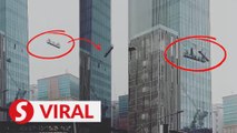 Two window cleaners in Oklahoma City had a lucky escape after the lift they were in swung wildly at the top of a skyscraper