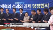 당정청 "국가수사본부 신설 추진•경찰 외부통제 강화"<br /><br />South Korea will seek to establish a state investigative agency that will manage probes by the police,... as part of plans to reform the police organization.<br />The decision was reached between the ruling Democratic Party, the government and the presidential office on Monday.<br />The three sides said the agency will be aimed at preventing high-ranking officers or those not related to investigations from intervening.<br />They also agreed to push to revise laws to block intelligence officers from becoming involved in illegal acts, such as surveillance of civilians or political intervention.<br />This comes amid concerns the police may become too powerful... after the National Assembly introduced a bill that would boost their investigative rights,... by diluting those of the prosecution.<br />The three sides said... the bill is not about empowering a particular organization,... but instead balancing their powers to keep each side in check.<br />They also vowed to draw up further measures to ensure the police don't abuse their power,... as well as speed up efforts to introduce an autonomous police system under which some authority will be transferred to local governments from the state police. <br />