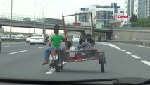 Sepetli motosikletle TEM'de yolculuk yapan 4'ü çocuk 6 kişi kameralara yakalandı. Motosiklet kullanan kişi dahil kimsenin kask takmaması dikkat çekti. <br><p>Kendi hayatlarını hiçe sayarak, sepetli motosikletle TEM'de tehlikeli yolculuk yapan 4'ü çocuk 6 kişi kameralara yakalandı. Motosiklet kullanan kişi dahil kimsenin kask takmaması da dikkat çekti.</p><p>İstanbul Seyrantepe Mevkii'nde kameraya yakalanan tehlikeli yolculukta, motosikleti kullanan yetişkin kişinin arkasında bir çocuğun oturduğu görülüyor. Sonradan eklenmiş olduğu anlaşılan sepette ise biri iki çocuk ön tarafta otururken, bir kadın da kucağında bir çocukla arka tarafta oturuyor.</p><p>Motosiklet sürücüsü ve yolcuların hiçbirinin kaskının olmaması ise ayrıca dikkat çekiyor.</p>Haber</a><br /><br />https://www.haberler.com/sepetli-motosikletle-tem-de-tehlikeli-yolculuk-12119045-haberi/