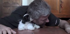 Un adorable petit chiot joue avec son maître. Il va vous faire craquer