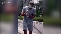 A caring driver saved a stray puppy from the middle of a busy highway in Thailand.<br /><br />Passing motorist Aphichet Thongloedlam, 28, noticed the brown Aspin cowering in the hedgerow in the middle of the highway in Phetchabun region in central Thailand on 25 May.<br /><br />After parking his car he braved the busy road to save the stray dog.<br /><br />The frightened puppy was at first reluctant to come out of the hedge where it was hiding, but its saviour eventually tempted it out and took it into his own care as a pet, until a permanent home could be found for it.<br /><br />Mr Thongloedlam said: ''He looked so frightened. I knew I had to stop and help. I will care for him until someone wants to adopt him.’'