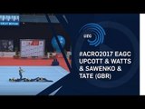 UEG Official – 28th Acrobatic Gymnastics European Championships, Rzeszow (POL), October 19 - 22, 2017<br /> <br />Men's group: Noam PATEL, Bram GEUSENS, Jonas ANTHOON & Hannes GARRE (BEL) 83.190<br />Combined exercise: D 2.17, A 9.200, E 16.900 = 28.270<br />Balance 27.530, dynamic 27.390<br />All-around final seniors ... 4th place!<br /><br />Follow the European Union of Gymnastics (UEG) on its channels to stay up to date with the latest news! <br />YouTube: https://www.youtube.com/channel/UCqB9...<br />Facebook: https://www.facebook.com/UEGymnastics<br />Twitter: https://twitter.com/UEGymnastics<br />Website: http://www.ueg.org/