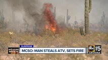 Mans steals ATV, starts brush fire near 143rd Avenue and Jomax Road.