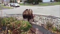 These two baby moose were seen head butting each other playfully in a person lush green backyard. They ran around chasing each other and playing around.