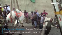 In Karachi in Pakistan sind mehrere Rinder per Kran von einem Dach auf den Erdboden gehievt worden. Es ist wohl ihre letzte Reise: Zum Opferfest landen tausende von ihnen auf den Tellern.