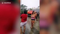 Dramatic moment families are rescued after storm washed away road next to their homes