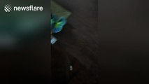 Jet, the curious dog, went rummaging in the closet and got his head stuck in his owner's trousers. He struggled hard trying to wiggle himself free but without any success. Finally, his owner came in the scene and removed the pants from his face, putting his misery to an end.