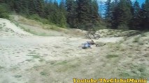 When this mountain biker and his partner were biking down the hill, he turned his handlebars and jumped over a slope due to which his front tire landed very hard on the trail. This causes him to topple over the front of his bicycle and he landed onto the ground. Thankfully, he did not hurt himself.