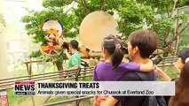 추석 특식 먹는 에버랜드 동물들<br /><br />Chuseok is the time to indulge in food and drink.<br />Not only for us humans but also for the animals we love, like at the Everland Zoo, where the animals are getting some treats of their own ahead of the holiday.<br />Our Eum Jiyoung has more. <br />Chuseok will be just like any other day for the critters at South Korea's Everland Zoo, but last week, ahead of time, they had a special feast... and plenty of guests to entertain.<br />A 5-year-old red panda named Lessy is loving the special treatment. He got a traditional Korean plate called a 'Gujeol-pan' full of fruits like bananas, apples and tomatoes.<br />This bundle of fur, perched in a tree, is in an extra good mood today, greeting his keeper and the dozens of visitors who ooh and ahh.<br />"That panda is eating all that delicious fruit. I want to get some for Chuseok too "<br />The ring tailed lemurs are also getting some treats.<br />It's up to the zookeeper, who's wearing the traditional Korean 'Hanbok,' to make sure they all get to enjoy the feast.<br />It's fun for the visitors to watch the animals find, play with and eat their treats.<br />"We're doing this to celebrate Chuseok and have some fun with the animals living here at the zoo. We've set up some special ways to feed them, like the Gujeol-pan and putting bananas in the hay."<br />The treats are different for each species. Elephants get bundles of hay decorated with fruits and vegetables, which they gather around and put their snouts in.<br />The zoo is located in Yongin, Gyeonggi-do Province, and is home to more than 1,600 animals.<br />The pre-Chuseok feast has been a pleasure for the animals and zoo-goers alike. <br />Eum Ji-young Arirang News. <br />