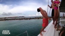 This guy stacked two cushiony mattresses on top of each other, in his backyard. He started jumping on them like he was on a trampoline, attempting to warm up for a backflip. Unfortunately, when he jumped, he couldn't complete the rotation and fell to the ground. Meanwhile, a kid and dog came running to check on him.