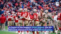 In honor of the league's 100th season, the NFL Network released its list of the 100 best plays.<br /> <br />1. "Immaculate Reception"<br />In the winning play from the 1972 AFC divisional playoff game, Pittsburgh Steelers running back Franco Harris caught a deflected pass and ran it in for a touchdown in the 4th quarter. <br /><br />2. "The Catch"<br />The game-winning pass from Joe Montana <br />to Dwight Clark from the <br />1982 NFC Championship game sent the San Francisco 49ers <br />to the Super Bowl. <br /><br />3. "Helmet Catch"<br />New York Giants receiver David Tyree <br />pinned the ball to his helmet to <br />secure a catch in the 4th quarter. The Giants defeated the New England Patriots <br />to win Super Bowl XLII. <br /><br />4. "Music City Miracle"<br />Tennessee Titans receiver Kevin Dyson caught a lateral from Frank Wycheck with 16 seconds left and returned it for a 75-yard touchdown to defeat the Buffalo Bills in a 2000 AFC Wild Card game.<br /><br /><br />5. Malcolm Butler Interception<br />Seattle Seahawks quarterback Russell Wilson <br />threw an interception from the 1-yard line <br />with 26 seconds left. New England Patriots cornerback Malcolm Butler jumped the route to clinch Super Bowl XLIX.