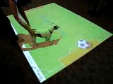 Angus, the bulldog, was playing football with his owner at a park. He amazingly caught the ball in the air and saved the goal as his owner kicked it.