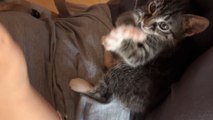 This kid was playing with a kitten lying on its back on the bed. He rubbed their belly and then lifted their palms, similar to doing jazz hands. The kitten copied the hand movements of the kid and lifted their paws.