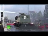 Chilean authorities use a water cannon to disperse crowds of anti-government demonstrators protesting in Santiago on November 13.