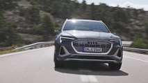 "The future is electric" - Audi is staying consistently true to its strategic alignment by presenting the second model in its e-tron product line. The Audi e-tron Sportback is a dynamic SUV coupé offering up to 300 kW of power and a range of up to 446 kilometers (277.1 miles) (in the WLTP cycle) from a single battery charge. Its digital matrix LED headlights are a new feature now available for the first time in a mass-production vehicle. Their light is broken down into tiny pixels and can be controlled with exceptional precision. This makes safe lane centering easier on narrow stretches of road and shows the position of the vehicle in the lane. The Audi e-tron Sportback can be ordered as of the end of November 2019. Market introduction in Europe is scheduled for the spring of 2020.<br /><br />Elegant, efficient, expressive: the exterior desig<br />The Audi e-tron Sportback combines the power of a spacious SUV with the elegance of a four-door coupé and the progressive character of an electric car. It is 4,901 millimeters (16.1 ft) long, 1,935 millimeters (6.3 ft) wide and 1,616 millimeters (5.3 ft) high. Its roof extends flat over the muscular body, dropping down steeply to the rear-in typical coupé style- and flowing into the steeply raked D-pillars. The lower edge of the third side window rises towards the rear-a typical Sportback feature.<br /><br />With the octagonal Singleframe, the powerful contours above the wheels, and the sculptural rear end, the Audi e-tron Sportback is perfectly aligned with the brand's design idiom. Details signal to the outside world that the SUV coupé is fully electric. The largely enclosed Singleframe with its vertical struts is presented in a light platinum gray-a specific identifying feature of the e-tron models. In the lower area of the matrix LED headlights, four horizontal segments create the e-tron-specific signature in the daytime running lights. This is taken up at numerous points on the model and interpreted in three dimensions, for example, on the striking side sills. Their black inlays draw the eye to where the battery, and thus the energy center, of the Audi e-tron Sportback can be found. The designers also varied the signature at the broad diffuser, drawing attention to the absence of exhaust tailpipes. A light strip connects the LED lights to one another.