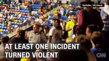 Footage has emerged of a protester being ejected from a Donald Trump rally in Pennsylvania, as the president taunts security.<br /><br />The president's comments at the Keep America Great Rally in Hershey, where he taunted security for not roughing up the protester, later drew criticism.<br /><br />The woman was wearing a T-shirt with a pink outline of a hand with a raised middle-finger and the words "grabbing power back", in an apparent reference to comments made by Trump about grabbing women by the genitals.<br /><br />During the rally he returned to familiar themes: accusing "Obama's FBI" of being behind a witch hunt against him, and lashing out at critics.<br /><br />The mood was not entirely negative however, with people in the crowd dancing along to the Village People hit 'YMCA', widely considered a gay anthem.