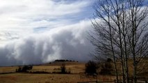 A snow squall was seen sweeping over Jersey City in New Jersey, causing a whiteout. White clouds were seen forming over tall buildings, creating low visibility.