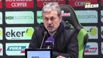 Süper Lig’in 16. hafta maçında evinde Trabzonspor’a mağlup olan Konyaspor’un Teknik Direktörü Aykut Kocaman, maç sonu açıklamalarda bulundu. Sıkıntılı bir süreçten geçtiklerinin aşikar olduğunu kaydeden Kocaman, “Maç öncesi duruma şöyle bir bakıldığı zaman son iki hafta toparlanma emareleri gözüküyordu takımda. Gaziantep maçında özellikle son derece kuvvetli bir oyun, çok kaçan fırsatlar, galibiyete çok yakındık. Ancak başaramadık. Başakşehir deplasmanında dirençli oyun, bu maç öncesi iki takım arasındaki durumdan kaynaklanan beklentiler, her şeyi yan yana getirdiğimiz zaman maç biraz ortada gözüküyordu. İhtiyaçlar, davranışları belirliyor. Acil puan almaya ihtiyacımız olan bir maçtı. Aynı şekilde Trabzonspor da tabii doğal olarak yukarıdan kopmamak, iddiasını sürdürmek için bunu istiyordu. Ancak takımda toparlanma eğiliminin yüksek olması umut vericiydi. İlk yarı biraz daha Trabzonspor’un kontrolü altında geçti. Saha yerleşimi daha iyiydi, topu çok kolay çevirdiler. Bizim savunma arkamıza geçmeye çalıştılar. Aslında pozisyon olarak bakıldığı zaman çok fırsat vermedik. Ancak etkili ataklar üretebilmemiz konusunda olumlu bir şeyler söylenemez. Genel olarak oyunda tutunma arzusu, bir şeyler yapma arzusu yüksekti ilk yarıda. Yalnız bunu tabii kaliteye, üretime dökebildiğimiz söylenemez. Bunun yanı sıra Trabzonspor 34-35. dakikalarda artık klasikleşmiş halleriyle, Sörloth’un olağanüstü vuruşuyla öne geçti. İkinci yarı oyunu tamamen rakip sahaya ittik. Hem oyunun kontrolü elimizdeydi hem çok baskı yaptık. 10 kişi kalana kadarki süreç hemen hemen böyle sürdü. 10 kişi kaldıktan sonra hakikaten takımdaki hangi oyuncu vuruş bakımından en yüksek kaliteye sahiptir dense, 2 senedir çok oynamamasına rağmen Hurtado denir. Hurtado’nun ayağına neredeyse dürtme gerektirecek bir pozisyon geldi, onu da yapamadık. 10 kişi kaldıktan sonra da oyunu çevirmek için çok istedi oyuncular ama tabii bu kadar puan ihtiyacının yüksek olduğu dönemde bunlardan bahsetmenin bir anlamı yok. Son derece kuvvetli bir şekilde oynamak için çaba gösterdiler. Dolayısıyla oyuncular için söyleyeceğim bir şey yok. İstemediğimiz bir sonuç olduğunu söyleyebiliriz” ifadelerini kullandı.<br />