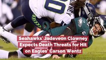 Seahawks' Jadeveon Clowney <br />Expects Death Threats for Hit <br />on Eagles' Carson Wentz.<br />Clowney's helmet-to-helmet hit knocked Wentz <br />out of the game in the first quarter.<br />There might be death threats. , Jadeveon Clowney, via statement.<br />Clowney called Philadelphia fans the <br />"worst fans in the world" after the game.<br />That's a great player over there for their team and for their organization. I hope he's OK. Like I said, I didn't intend to hurt him. , Jadeveon Clowney, via statement.<br />I thought it was just a small hit, but everybody was going crazy on the sidelines. I was just trying to finish the play, but it happened. , Jadeveon Clowney, via statement.<br />Clowney was not penalized for the hit, but Eagles fans and players were outraged after seeing the replay.<br />I just told him, 'man, that's a dirty play.' ... I just kept reminding him, 'come on, man, stay off my quarterback.' , Jason Peters, Eagles left tackle, via statement.<br />Veteran quarterback Josh McCown replaced <br />Wentz and kept the game close.<br />but the Eagles eventually lost 17-9 <br />to the Seattle Seahawks