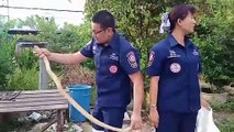 This is the moment a ferocious cobra was caught after spitting venom at a family's pet dog.<br /><br />Pittaya Surattana, 47, heard his cross-bred Thai Ridgeback dog barking at the reptile to prevent it from getting into the home in Udon Thani, northeastern Thailand on Tuesday (January 14) morning.<br /><br />He came to the dog at his lawn and saw the mutt, named Phetch, was squaring up to the cobra. The serpent spat the poison at the brave pet pooch and slithered into the bush.<br /><br />The host rushed into the house and called the rescuer team to catch the ferocious snake while he was busy cleaning his dog's eyes.<br /><br />Officers snared the 3ft long cobra in the bush strangling a rat - before releasing the rodent and turning its attention to the rescue team.<br /><br />They used two rods and finally managed to catch the deadly reptile.<br /><br />Pittaya said he was grateful to his loyal dog, who was not afraid to protect him and his family. <br /><br />He said: "We used to have two dogs, Phetch and his mother. They would both catch snakes before they had chance to get into the house.<br /><br />"Phetch's mother passed away a couple of years ago, but even though he's alone, he's still brave enough to face the dangerous cobra to protect us."