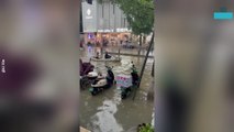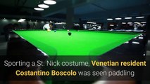 People Struggle While Trying to Cross Flooded Streets in Venice
