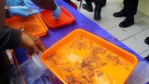 North Sumatra's police force seized 416 horseshoe crabs at the residence of illegal wildlife smugglers on March 12.<br /><br />Horseshoe crabs are a protected animal in Indonesia the animal's blood is often used as an endotoxin testing material.