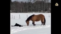 Ce cheval fait tout comme son humain... bain de neige