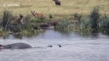 Witness the moment a formidable mother warthog protects her vulnerable baby from a hungry hyena lurking close. <br /><br />This rare sighting was captured during a Kruger Park safari in South Africa on June 9. <br /><br />Edrich, the filmer told Newsflare: "I was alone on a self-drive safari when I came across a lone hyena standing in the road. The hyena looked very focused on something in the bush next to the road and quickly ran into the bush towards something. <br /><br />"I managed to back up my vehicle to get a better view and was surprised to find a family of warthogs on the other side of the bush. <br /><br />"Suddenly the warthogs turned around and ran with the hungry hyena chasing after them. Warthogs have formidable defense weapons in the form of sharp tusks. It looked like the hyena understood the very danger of these warthog tusks.<br /><br />"While running away, the warthogs were vulnerable and the hyena would give chase but as soon as the warthogs turned around, the tables turned. It was amazing to watch the mother warthog standing her ground while guarding her youngster. <br /><br />The desperate hyena charged one last time towards the mother and the baby before the fearless mother warthog turned around and chased the hyena back to where he came from. The hyena finally got the message, lost interest, and walked off into the bush. <br /><br />"The warthogs continued down the road when I noticed a medium-sized open wound on the hind leg of the baby warthog. The injury to the baby warthog was most likely what attracted the hyena’s attention, thinking it would grab a quick snack."