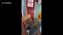 A cat with a teal leash is walking on the edge of a porch in Long Island, New York, when just as she started to turn on the bricks, she falls off the ledge on April 2, 2020.
