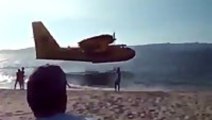 Firefighting Plane Refilling Next To Beach Shore