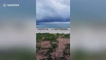 A huge waterspout tornado was seen sweeping across the ocean in southern Thailand’s west coast, yesterday afternoon (June 25).<br /><br />The water funnel in an elephant trunk shape started during a rain storm, surrounded by dark grey clouds in Krabi province.<br /><br />Wildlife officer Jampen Phompakdee from the Than Bok Khorani National Park recorded the long, thin water funnels stretching down from above the dark clouds into the ocean.<br /><br />Workers were amazed with the huge tornado that only lasted for ten minutes before disappearing. <br /><br />Jampen said: ''It was the most incredible phenomenon that we saw in the ocean. We wish it would not come close to the shore.''<br /><br />Waterspouts are intense columns of swirling tornado clouds that form over a body of water.<br /><br />They are most commonly found in subtropical areas and disappear shortly after they come into contact with land.<br /><br />Thailand's humid Southeast Asian climate combined with fierce thunderstorms can often give rise to waterspouts in coastal areas.<br /><br />The country has been experiencing powerful tropical storms for the last two months as the country moves into its hot summer rainy season.
