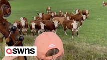 Gus, the bulldog, decided to have fun in the field with a herd of cows. They got up close and personal with them and ran around the place as they chased them. The cows seemed quite intrigued by the little animal's presence, and curiously followed them.<br /><br />*The underlying music rights are not available for license. For use of the video with the track(s) contained therein, please contact the music publisher(s) or relevant rightsholder(s).