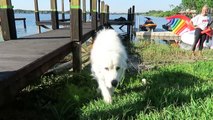 This dog, Macy loved to swim with her owner. As he swam across the river, Macy hopped onto his back and enjoyed her ride across.