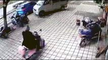 A delivery man held onto a bollard to avoid being blown away by powerful winds during typhoon Hagupit in eastern China.<br /><br />In the video, filmed in the city of Yuhuan in Zhejiang Province on August 4, a delivery man was forced to get off his scooter and squatted down beside a bollard to try and avoid being blown away by the strong winds.<br /><br />After several minutes, the delivery man struggled to get onto his scooter before driving away.<br /><br />The video was provided by local media with permission.