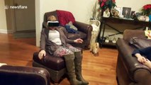 This guy was playing a virtual reality game. He was wearing a VR headset and had controls in his hands. Suddenly, he turned towards his friend who was sitting on a couch and screamed at him. Surprisingly, the guy screamed even louder than his friend and jumped on the couch.