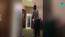 Joy, the cat, saw his owner practicing pole dance. He climbed on the bed and jumped straight on her legs while she was in the handstand position. However, he stood on her legs for a few seconds and then slowly climbed down.<br /><br />The underlying music rights are not available for license. For use of the video with the track(s) contained therein, please contact the music publisher(s) or relevant rightsholder(s).