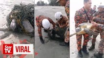 NGO group Trash Hero Mersing on Tuesday released a video of Mersing Fire and Rescue Department personnel helping a turtle to be released from a fishing net, plastic and trash on a beach. The rescue operation took place in Jan 2019.