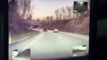 A truck fell off an overpass and almost crushed a motorcyclist in northern China.<br /><br />The dramatic CCTV video, filmed in the city of Shijiazhuang in Hebei Province on September 7, shows a truck full of iron beds suddenly falling off an overpass.<br /><br />The iron beds reportedly scattered from the truck and hit a white car parked under the bridge.<br /><br />Since the truck fell onto a traffic light pole first before landing onto the ground, the driver escaped death.<br /><br />The driver was sent to hospital for a checkup and he was not in life-threatening condition.<br /><br />The case is in further investigation.