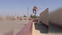 This man did an amazing freestyle skateboarding trick. He placed a skateboard on its edge on the road while standing on the other beside it. He jumped and flipped the skateboard on its edge and did a handstand on both of them. The man finished the trick by flipping back both the skateboards and standing on them.