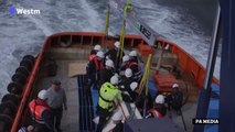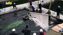 Two beluga whales from a Shanghai aquarium take their first swim in open waters as part of their acclimatisation to an Icelandic sea sanctuary.