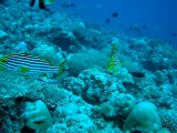 Gros rassemblement de carangues à proximité d'un ponton sur l'ile de Rannalhi, aux Maldives. <br />Des Vivaneaux à raies bleues profitent quant à eux de l'abri offert par le dit-ponton.