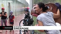 Cyclists and pedestrians stop to pose with a giant rampaging Tyrannosaurus Rex along a new cycling and jogging track in Singapore. Over 20 models from nine different prehistoric species are installed along the kilometre-long path, including bright blue velociraptors climbing on a buggy, a baby dinosaur hatching from an egg, and a long-necked apatosaurus peering at passersby over the fence. <br /><br />The Jurassic Mile is part of a new 3.5km connector that allows visitors to cycle into the city from the airport and vice versa. The attraction has already drawn controversy after it opened earlier this month. Changi Airport Group, which manages the path, installed additional netting after a stray ball from a nearby golf course hit a pedestrian and a dinosaur model was briefly removed for repairs after a video of a woman sitting on it went viral.