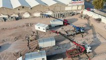 İzmir’de meydana gelen depremin ardından evi yıkılan ya da hasarlı olan depremzedelerin konaklayacağı konteyner kente, ilk konteynerler geldi.<br /><br />İzmir'de meydana gelen depremin ardından evi yıkılan ya da hasarlı olan depremzedelerin konaklayacağı konteyner kentteki çalışmalar sürüyor. Bir haftaya hazır olması beklenen konteyner kent alanı havadan görüntülenirken, ilk dört konteyner Erzincan'dan gelerek alana giriş yaptı.<br /><br />Konteyner kent, depremin en yıkıcı olduğu Bayraklı ilçesindeki Adalet Mahallesinde yapılıyor. 46 bin metrekarelik alanın birinci etap çalışmalarında 21 metrekarelik 550 konteyner kurulacak. Bir hol, bir oda ve bir duş bölümünün yer alacağı konteynerlerde 5 kişilik ailenin barınabileceği öğrenildi. Ziraat Gayrimenkul Yatırım Ortaklığı arazisi AFAD'a tahsis edilirken, çalışmalar AFAD koordinesinde Karayolları Genel Müdürlüğü ve Devlet Su İşleri destekleri ile devam ediyor. Yaklaşık 100 personelin çalıştığı konteyner kent alanının, sosyal donatıların hazırlanması ile birlikte yaklaşık bir haftada tamamlanması planlanıyor. Erzincan'dan getirilen ilk dört konteyner alana giriş yaparken, diğer konteynerlerin de kısa sürede gelmesi bekleniyor.