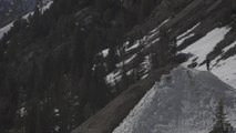 This guy skied down the mountain at high speed. He did a front flip and plowed through a pile of thick snow. He came to a stop after a short distance completely covered in ice.