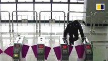 Rollerblader Jumps Over Woman Standing on the Ground