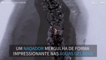 Nadador mergulha em lago congelado nas Terras Altas da Escócia