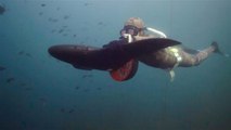 Kayakfahrer erhielten vor der Küste von County Mayo, Irland, Besuch von einer Gruppe Delfine. Die neugierigen Tiere kamen näher und schwammen um die Gruppe herum.
