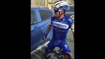 La réaction de Julian Alaphilippe (Deceuninck - Quick Step) après sa victoire sur la 2e étape de Tirreno-Adriatico devant Mathieu van der Poel (Alpecin-Fenix) et Wout Van Aert (Jumbo-Visma).